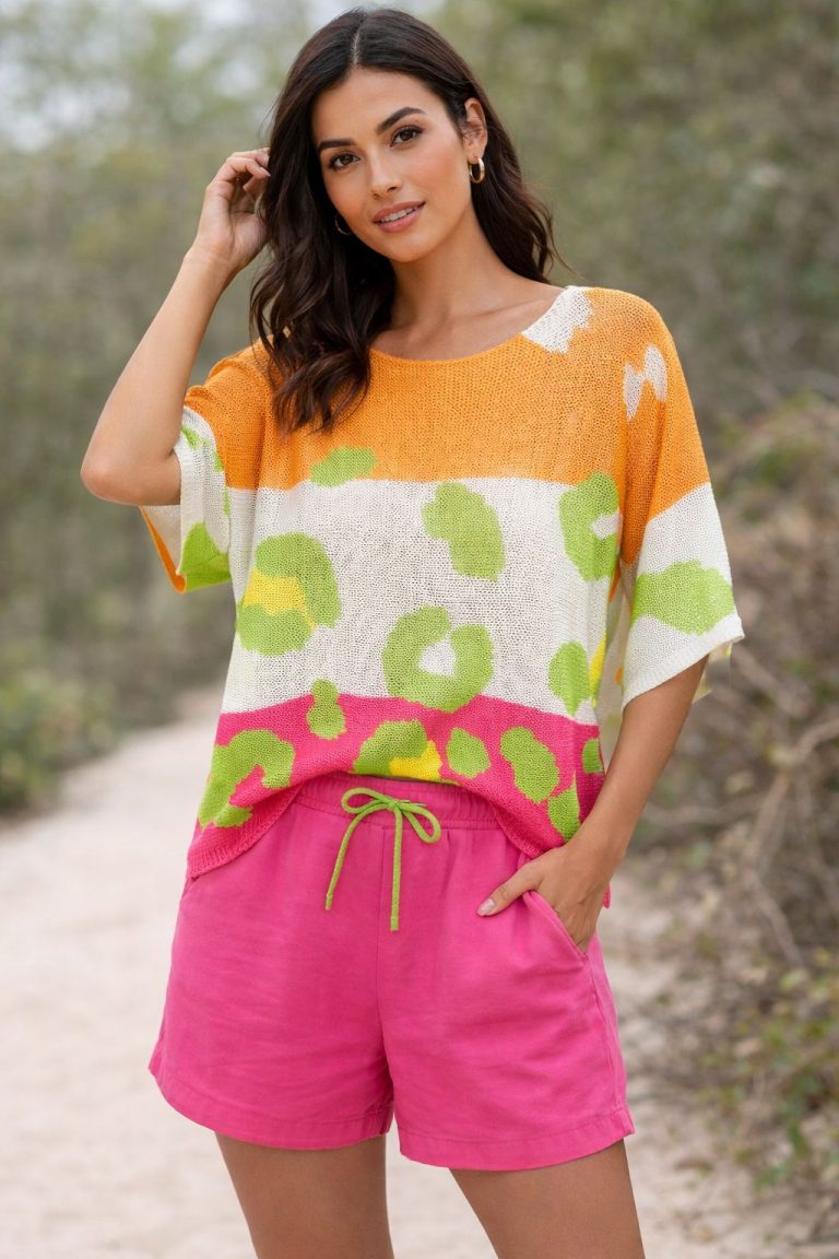 Das Model trägt einen stylischen Light Lemon Pullover mit leuchtendem gelben und grünen Muster - leicht, bequem und perfekt für den Sommer.
