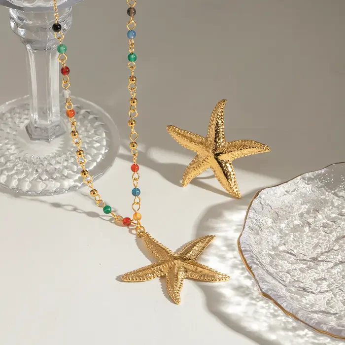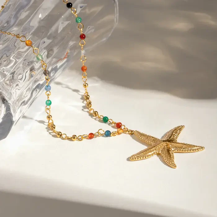 Lass Dich von maritimen Vibes inspirieren! Diese elegante Kette mit einem goldenen Seestern-Anhänger und bunten Details ist der perfekte Begleiter für Deinen Alltag oder besondere Momente. Sie vereint fröhliche Farben mit einem Hauch von Küstenromantik.