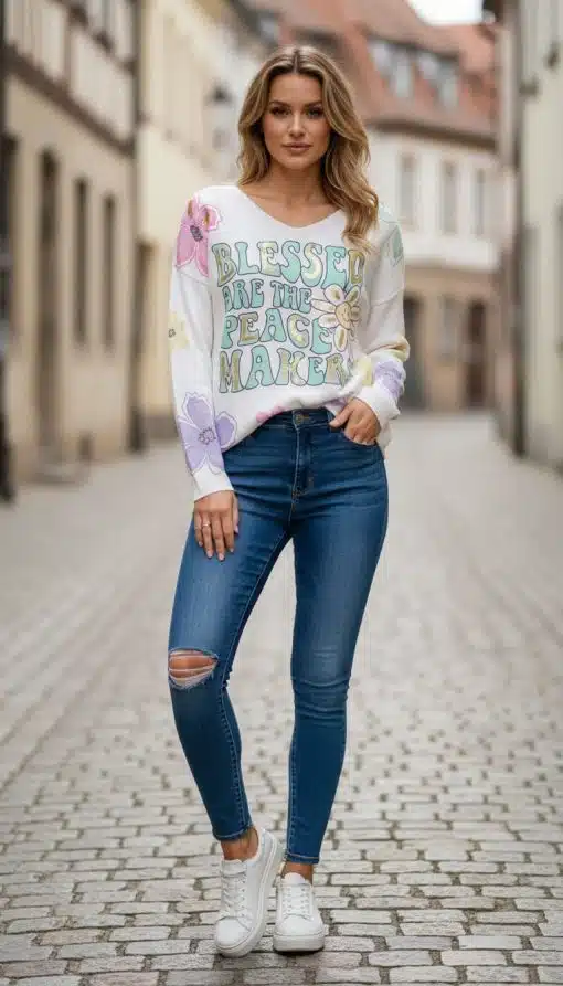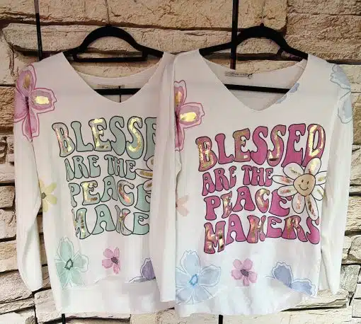 Das  Blessed Peacemakers kombiniert einen liebevollen Retro-Print mit farbenfrohen Blumen, Peace-Symbolen und dem Statement „Blessed Are the Peacemakers“. Das Design erinnert an 70s Flower-Power-Vibes und bringt gute Energie in jedes Outfit.