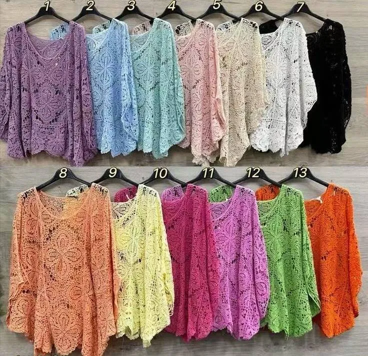 Dieses wunderschöne Spitzen-Oberteil überzeugt mit seinem filigranen Häkelmuster und einer entspannten, fließenden Passform. Das aufwendig gearbeitete Blumenornament verleiht dem Oberteil eine feminine Leichtigkeit, während der weite Schnitt für maximalen Tragekomfort sorgt.
