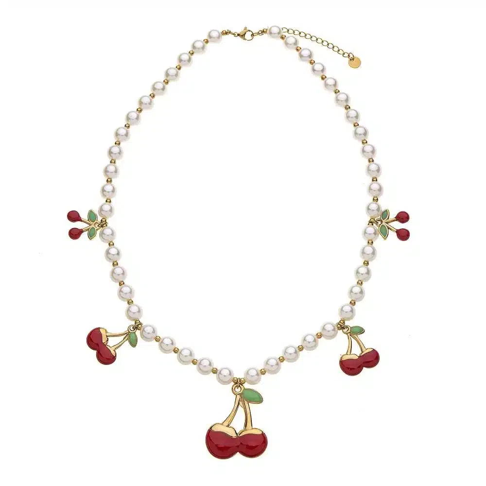 Diese hochwertige Halskette kombiniert klassische Perlen-Eleganz mit einem modernen, verspielten Twist: süße Kirsch-Anhänger in Rot und Grün treffen auf glänzende Perlen und goldfarbene Details – ein Look, der sofort auffällt und trotzdem stilvoll bleibt.