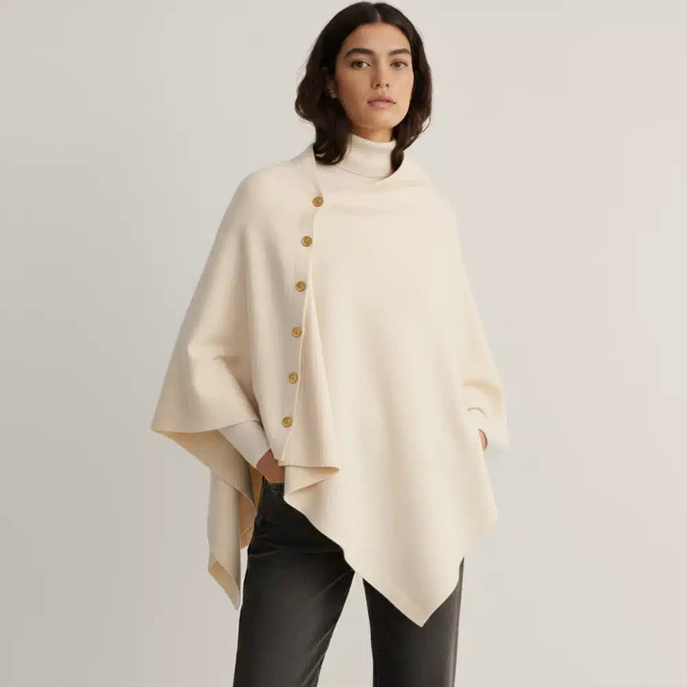 Die weiche, angenehm wärmende Qualität sorgt für hohen Tragekomfort und einen fließenden Fall. Durch die seitlichen Knöpfe lässt sich der Poncho vielseitig stylen – sowohl offen als lässiger Überwurf als auch geschlossen für einen eleganteren Look. Ideal für kühlere Tage als leichte Alternative zu Jacke oder Schal.