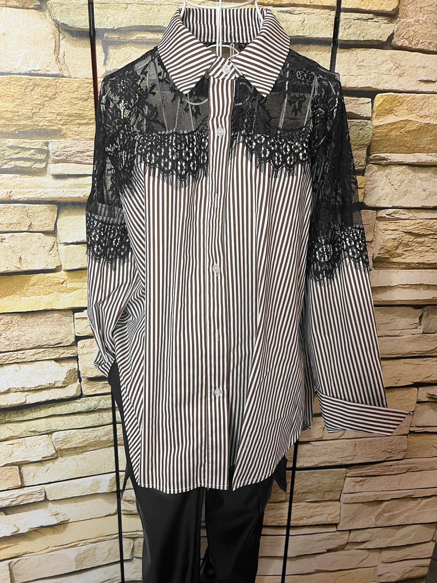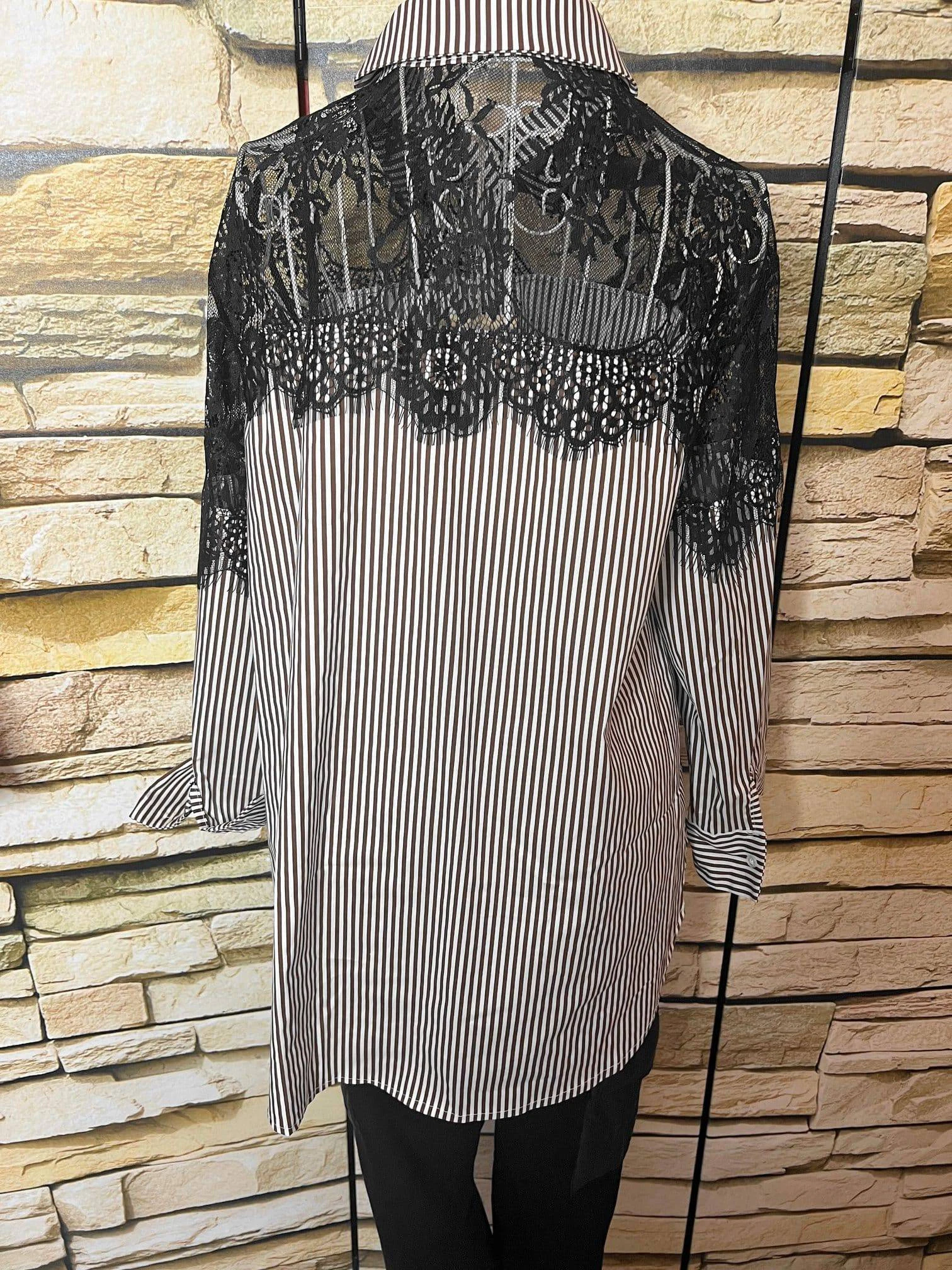 Diese elegante Bluse kombiniert klassisches Streifen-Design in Dunkelbraun mit femininen schwarzen Spitzen-Details. Die feine schwarze Spitze verläuft über die Schulterpartie und den oberen Rücken und setzt einen raffinierten Akzent. Der gerade Schnitt sorgt für eine bequeme Passform, während der Hemdkragen und die Knopfleiste für einen klaren, strukturierten Look stehen. Vielseitig kombinierbar – wirkt sowohl zu eleganten Stoffhosen als auch lässig zu Jeans. Ideal für Büro, Dinner oder besondere Anlässe.