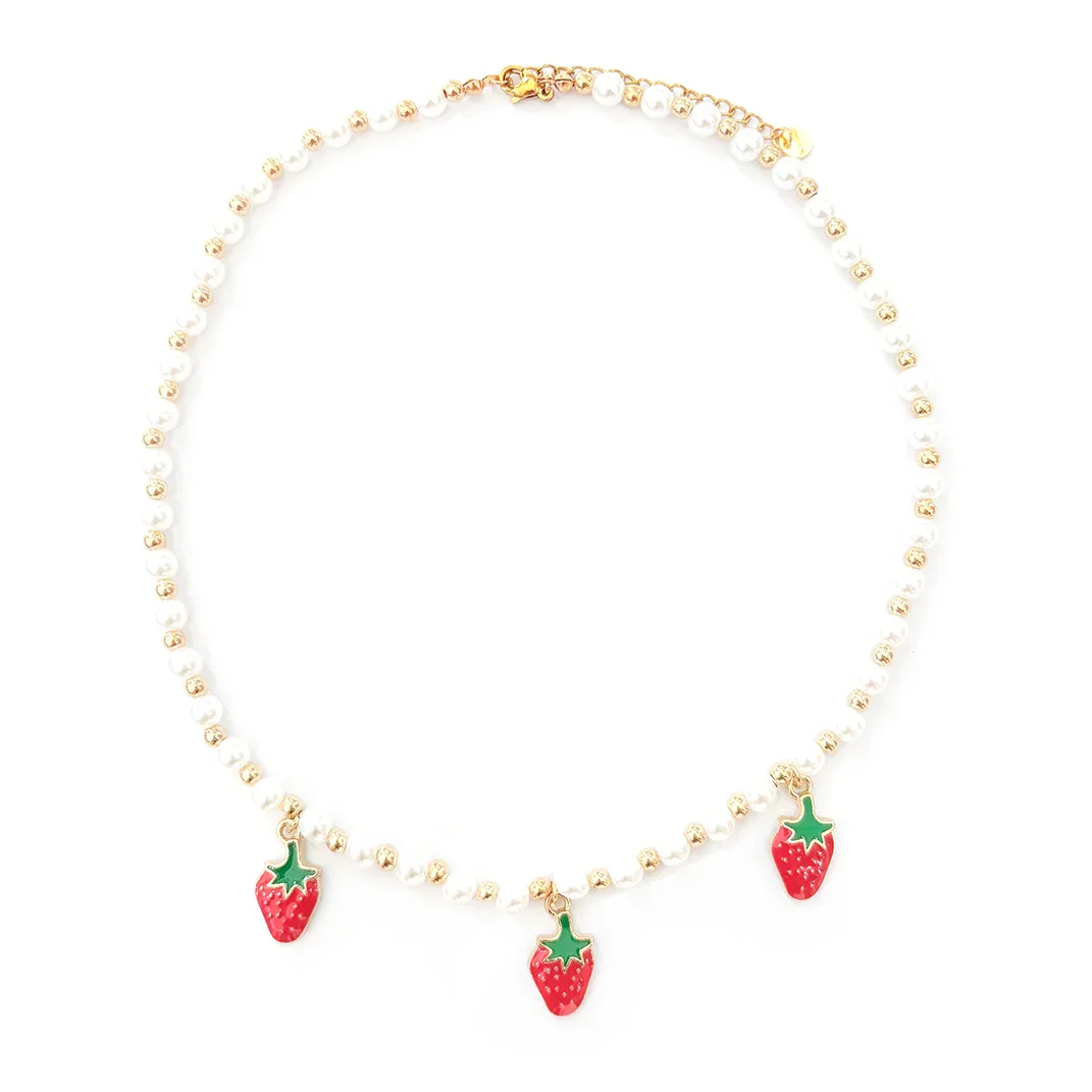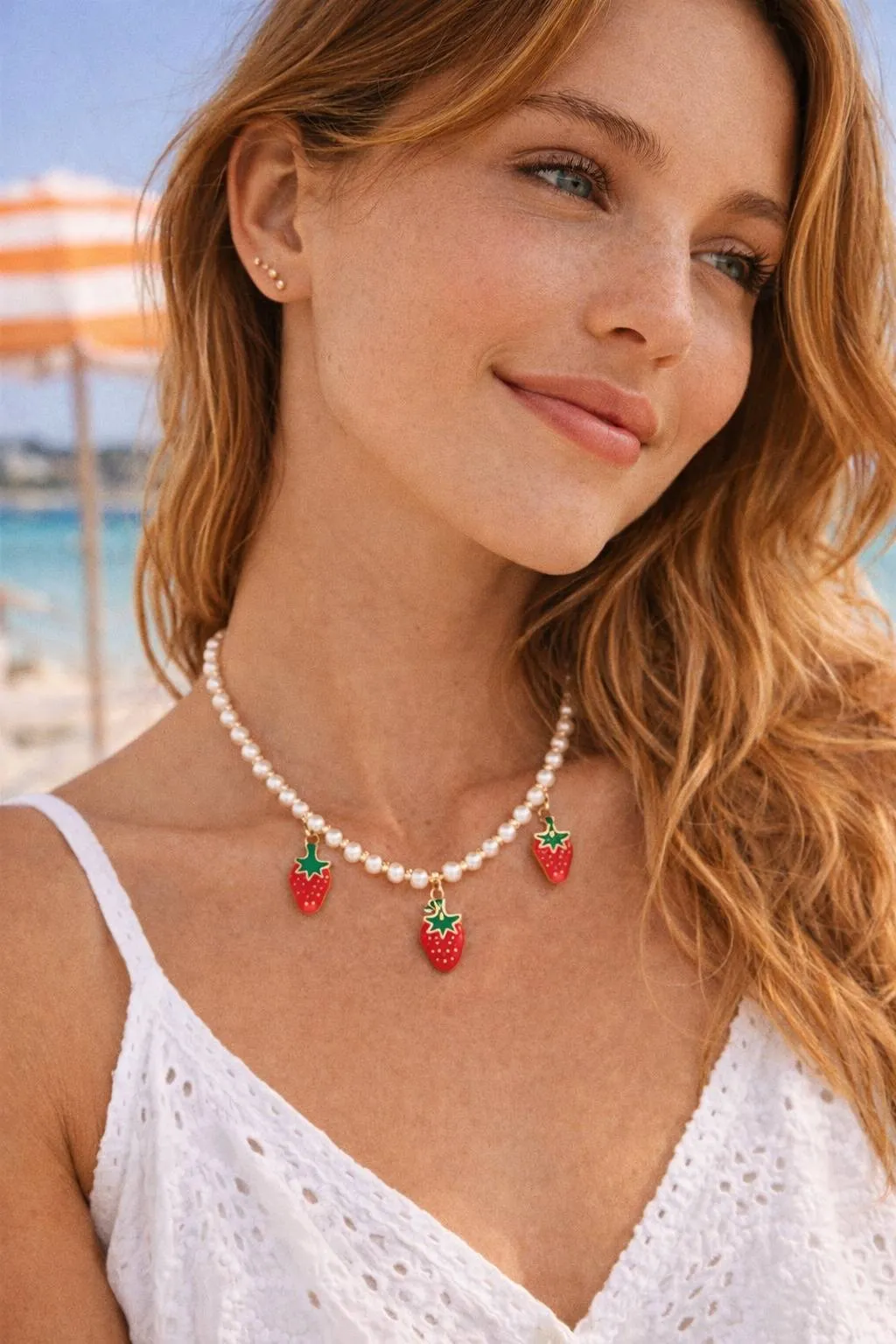 Diese hochwertige Halskette kombiniert klassische Perlen-Eleganz mit einem modernen, verspielten Twist: süße Erdbeer-Anhänger in Rot  treffen auf glänzende Perlen und goldfarbene Details – ein Look, der sofort auffällt und trotzdem stilvoll bleibt.