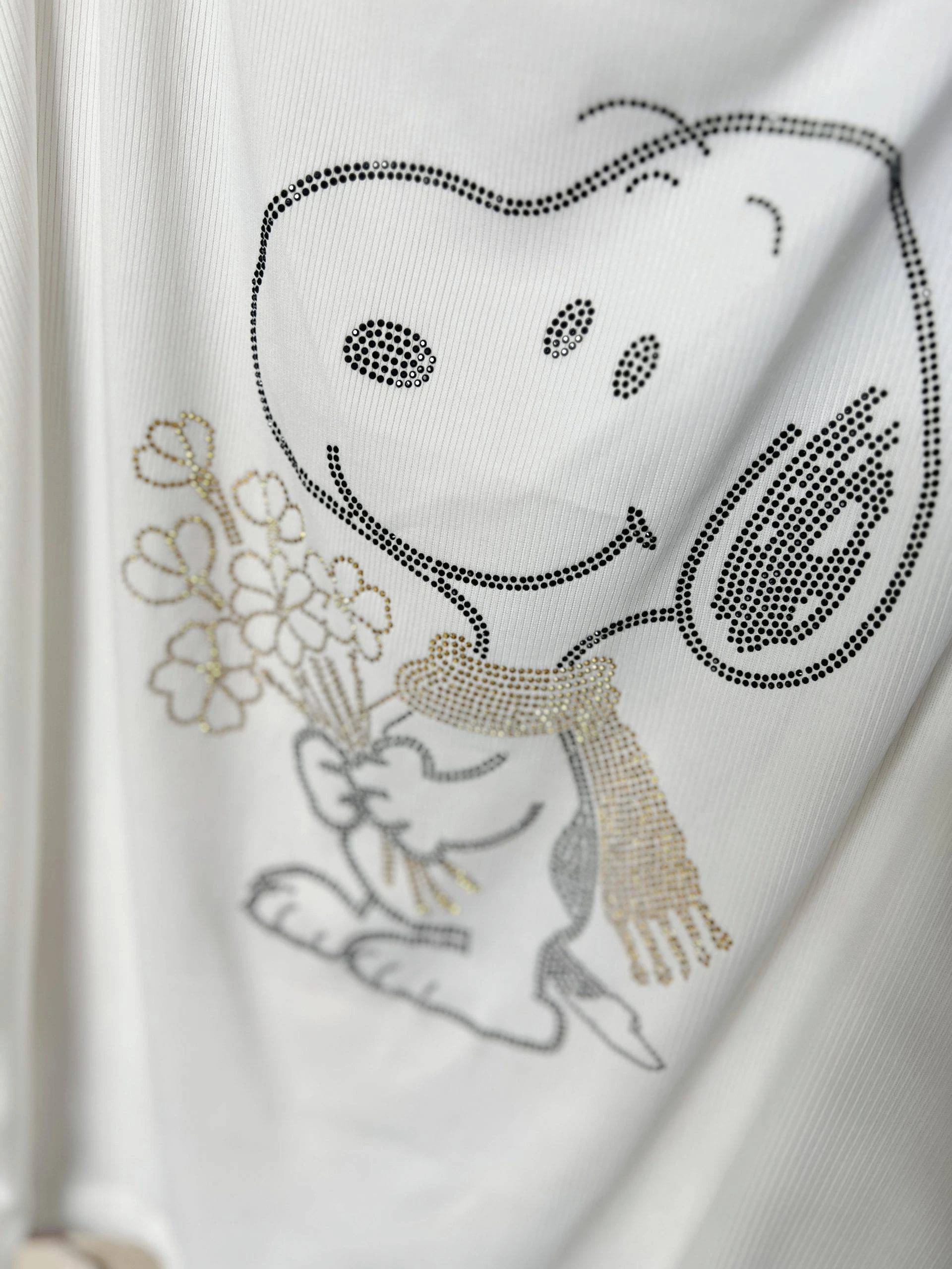 Das Highlight ist das liebevoll gestaltete Comic-Motiv, das mit feinen Glitzer- und Metallic-Details veredelt ist und dem Top eine verspielte, zugleich stilvolle Note verleiht. Ein echter Blickfang, der jedes Outfit aufwertet – ob im Alltag, im Urlaub oder in der Freizeit.