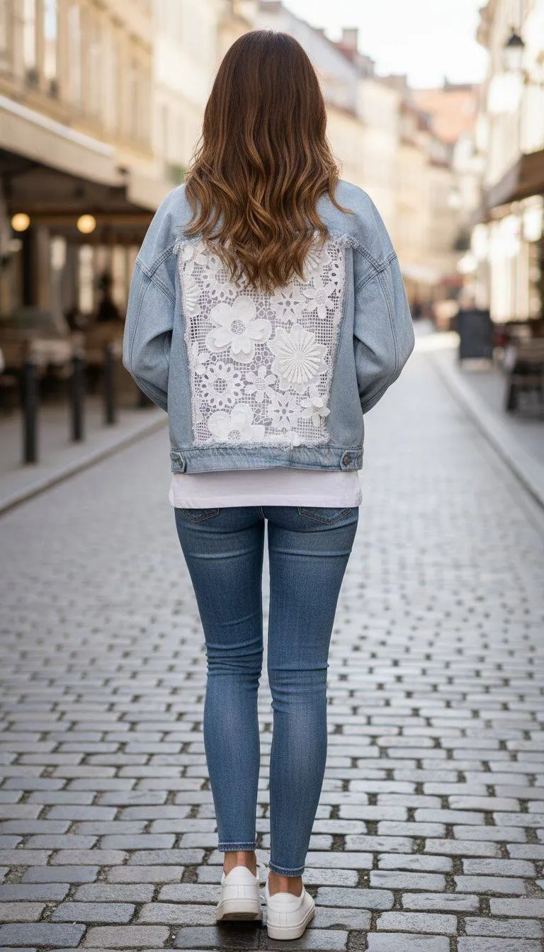 Dank der floralen Spitze ist diese Jeansjacke nicht nur ein praktisches Kleidungsstück, sondern auch ein modisches Statement, das jedem Outfit eine besondere Note verleiht. Ein Must-have für alle, die einen fröhlichen, modernen Stil bevorzugen!