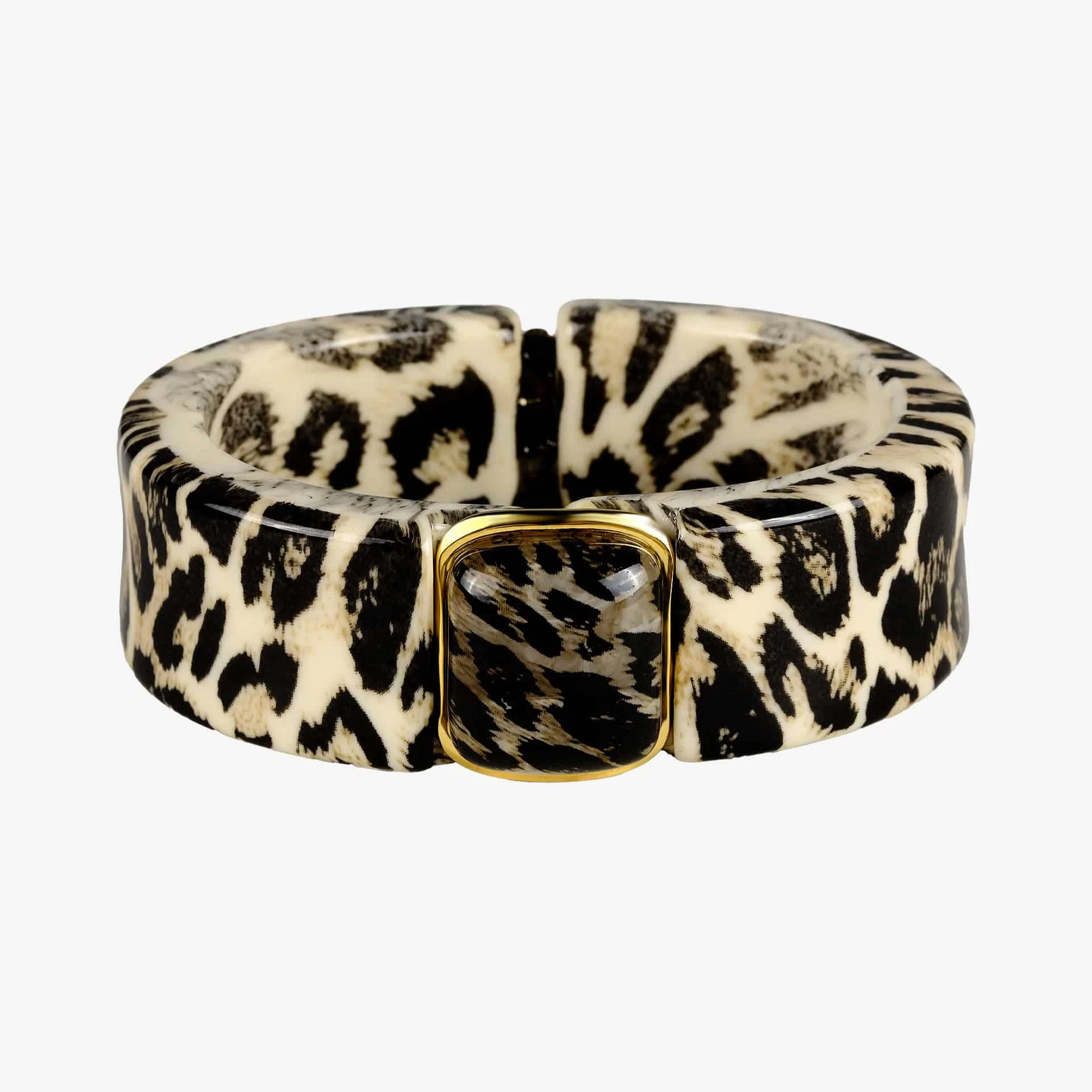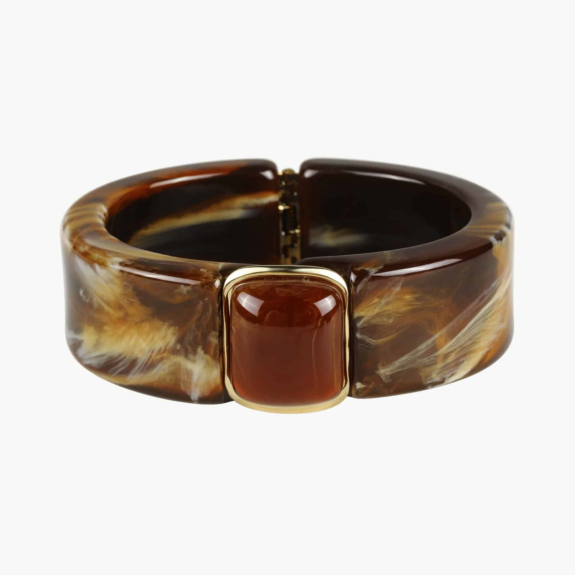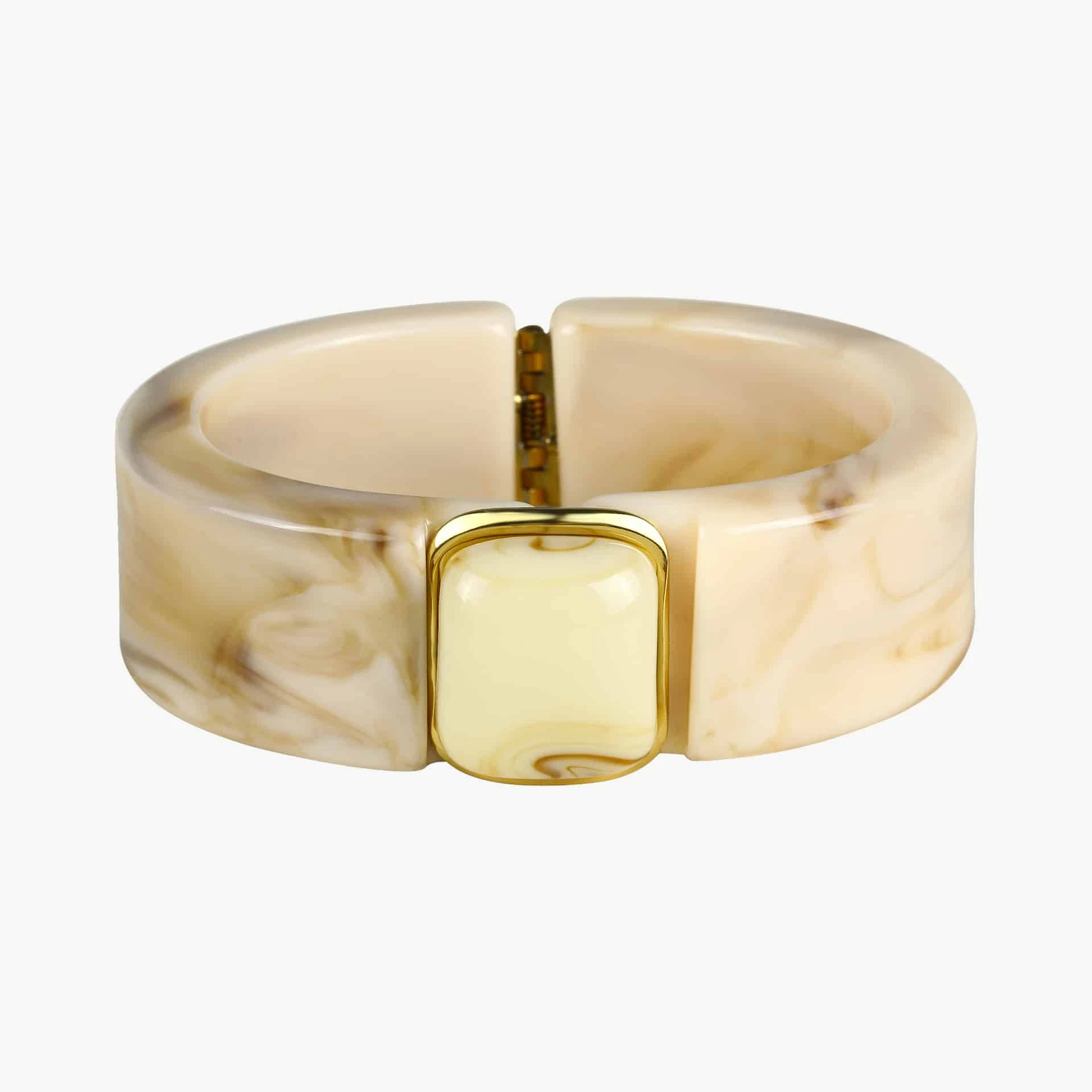 Gefertigt aus hochwertigem Edelstahl und robustem Acryl, besticht das Armband durch seine markante Form und den glänzenden Edelstein-Akzent in der Mitte. Die feine 14 Karat Vergoldung verleiht dem Schmuckstück einen luxuriösen Glanz, der jedes Outfit aufwertet.