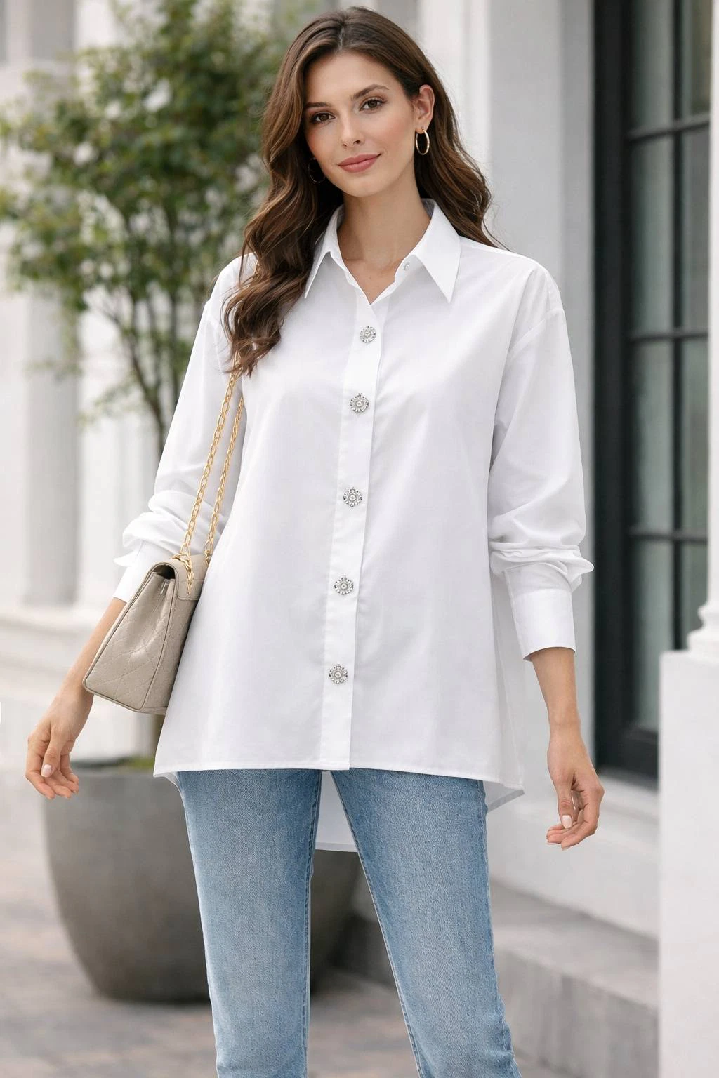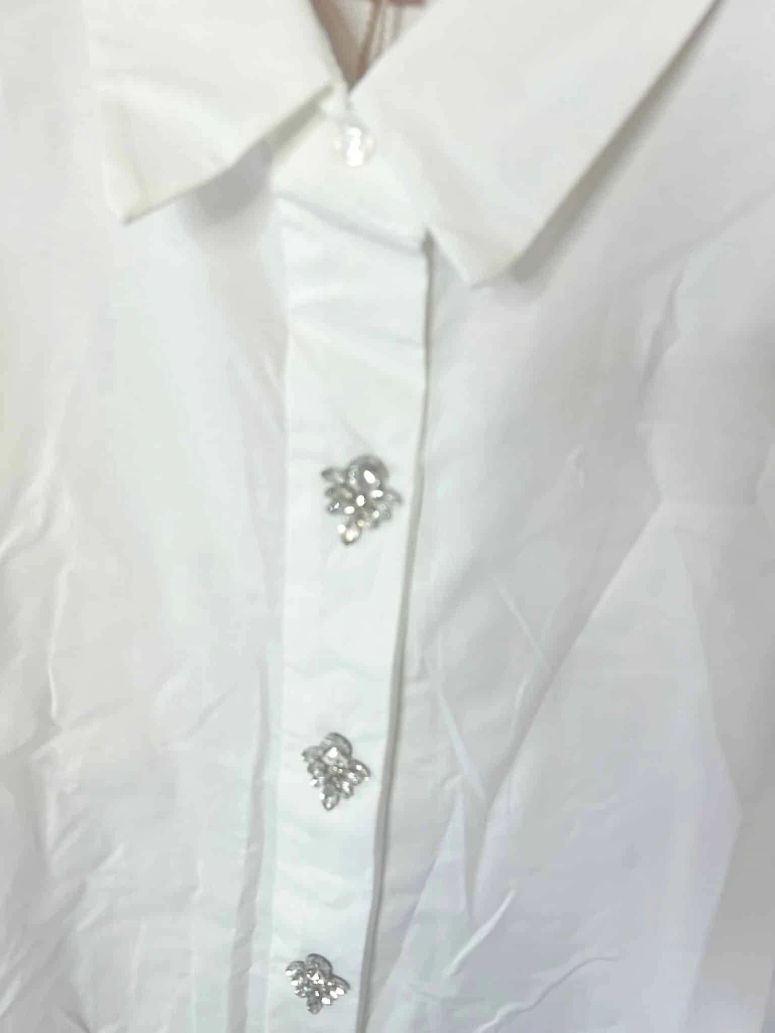 Diese weiße Hemdbluse von Zeta Otto ist ein echter Allrounder mit Wow-Effekt: Der cleane, zeitlose Look wird durch die funkelnden Strassknöpfe elegant veredelt und macht das Modell zu einem stilvollen Hingucker – perfekt für alle, die es schlicht mögen, aber nicht langweilig.
