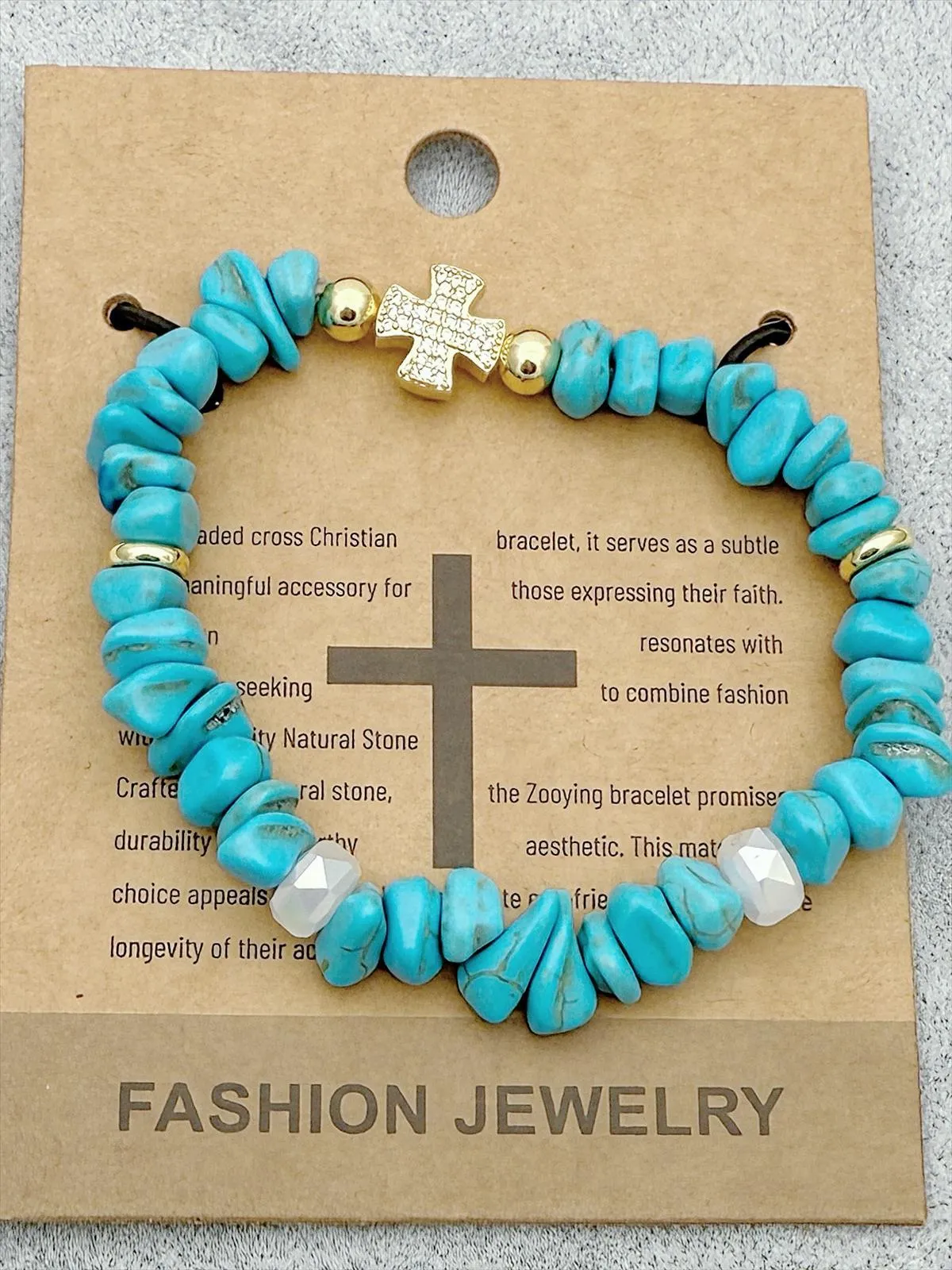 Dieses besondere Armband vereint natürlichen Stil mit einem symbolischen Detail. Die Perlen aus echtem Stein in einem wunderschönen Türkiston verleihen dem Schmuckstück eine natürliche und zugleich moderne Ausstrahlung. Das goldfarbene Kreuz-Element setzt einen eleganten Akzent und macht das Armband zu einem stilvollen Blickfang.