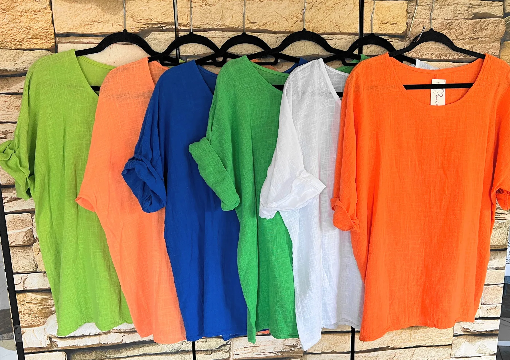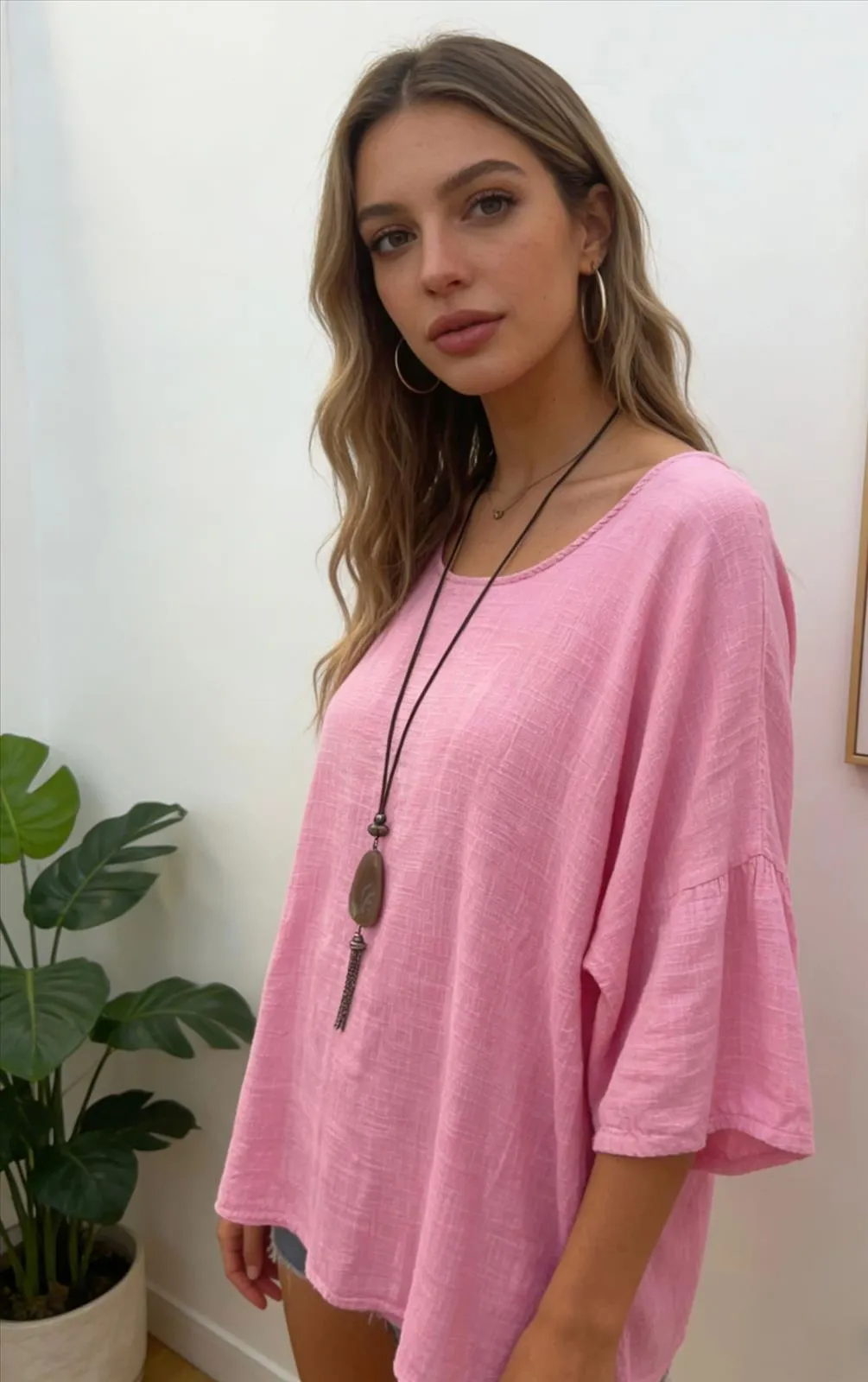 Der lässige Schnitt mit überschnittenen Schultern und weiten Ärmeln sorgt für eine entspannte Passform und viel Bewegungsfreiheit. Der weiche, strukturierte Stoff verleiht der Tunika eine natürliche, sommerliche Ausstrahlung und macht sie zu einem vielseitigen Begleiter für Alltag, Urlaub oder Strand.