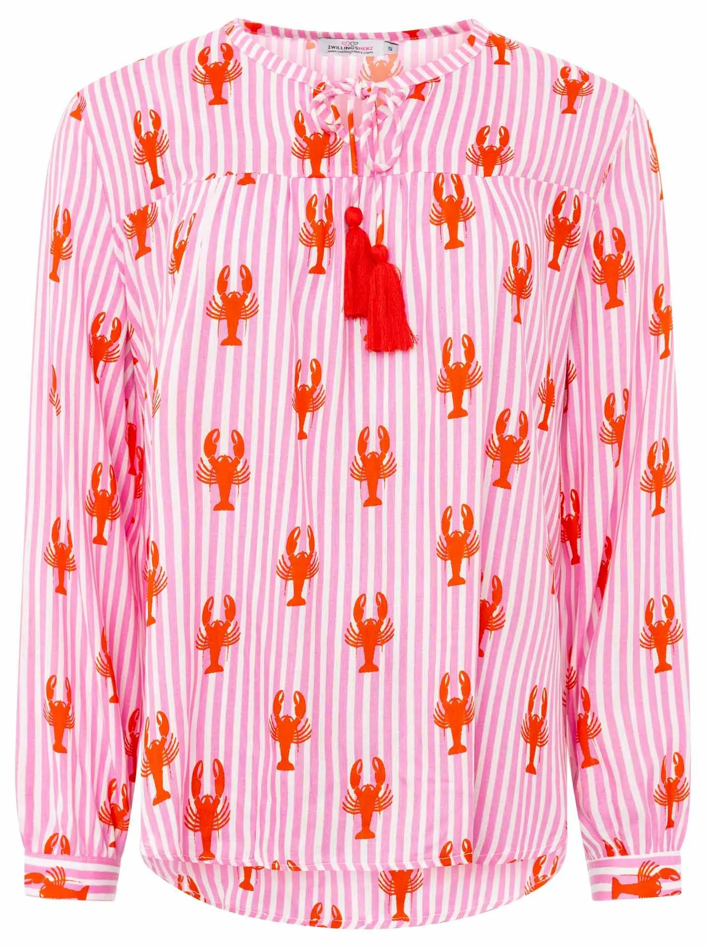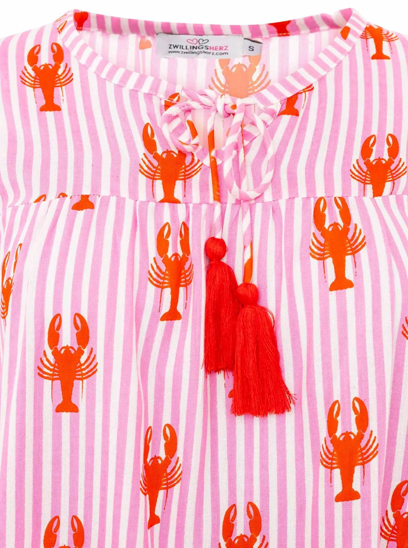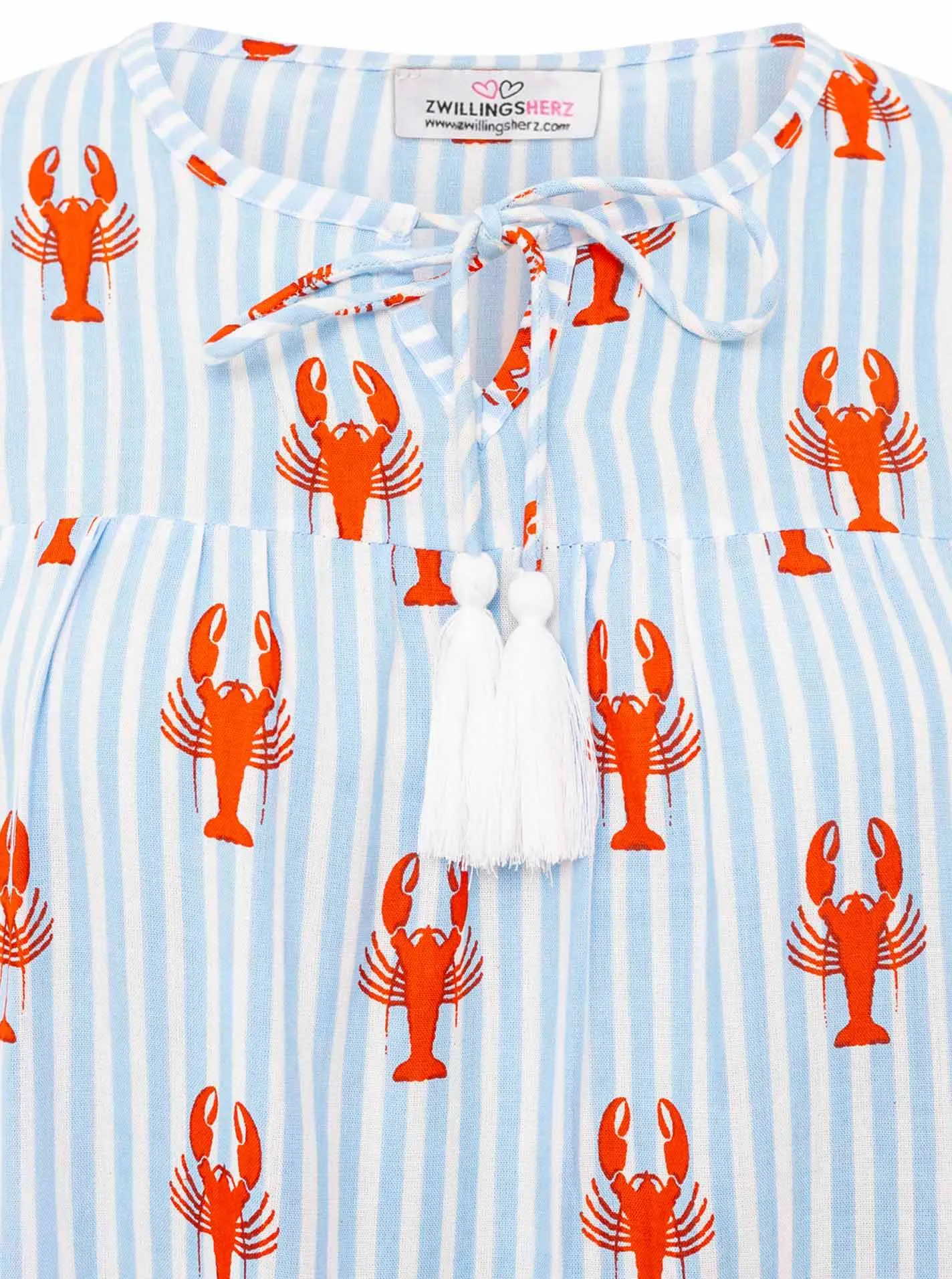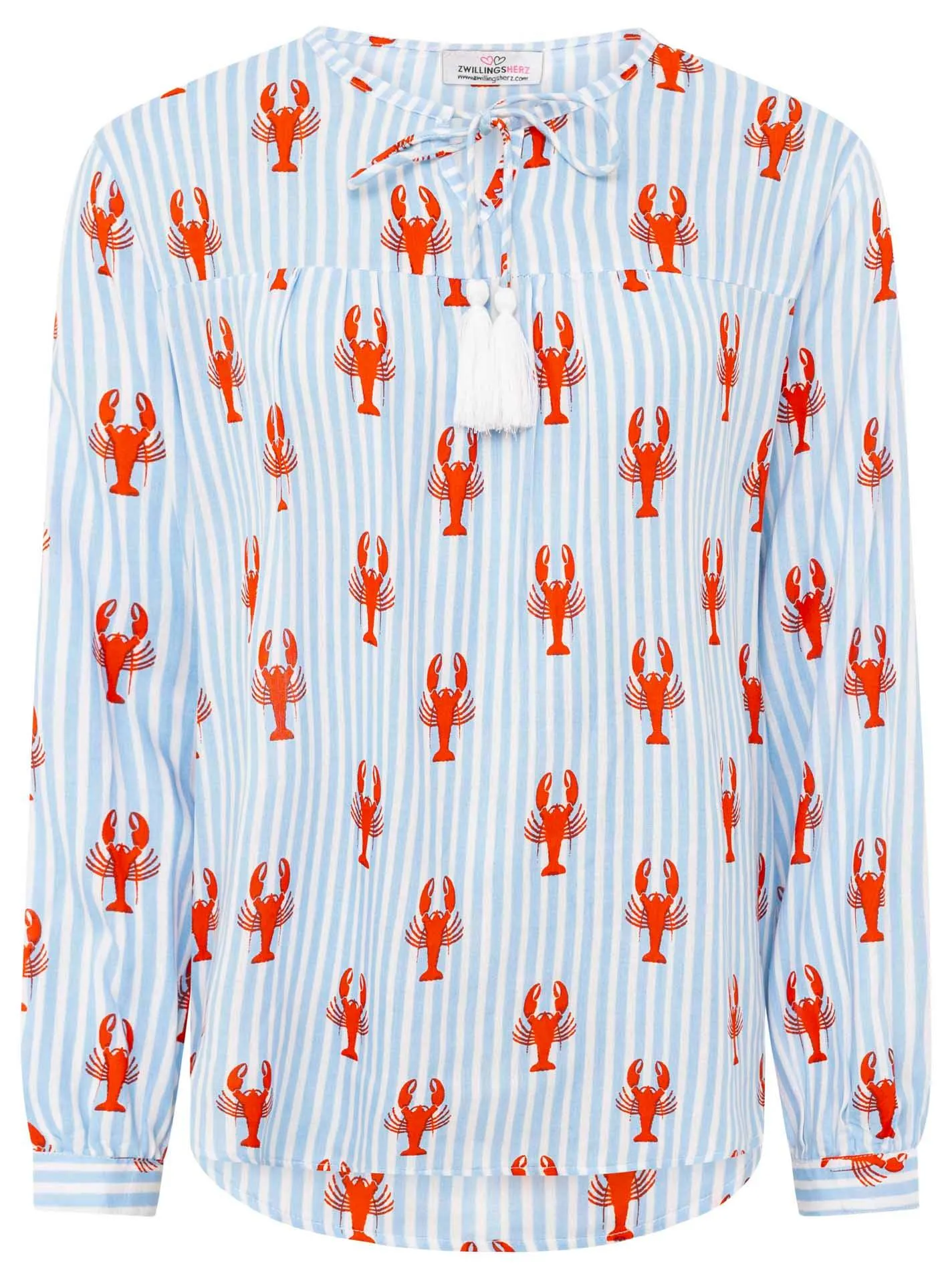 Die Bluse „Lobsters & Stripes“ verbindet klassische Streifen mit einem charmanten maritimen Design. Das feine Streifenmuster wird durch dekorative Hummer-Motive ergänzt und sorgt so für einen frischen, sommerlichen Look mit besonderem Charakter.