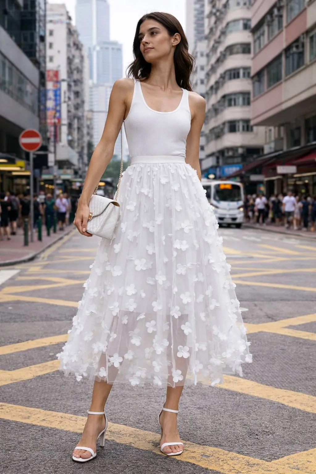 Romantisch, feminin und außergewöhnlich – dieser elegante Midi-Rock verleiht jedem Outfit eine besondere Leichtigkeit. Die zarte, transparente Tüll-Overlay ist mit aufwendig applizierten 3D-Blüten verziert und sorgt für eine edle, verspielte Optik mit modernem Couture-Charakter.