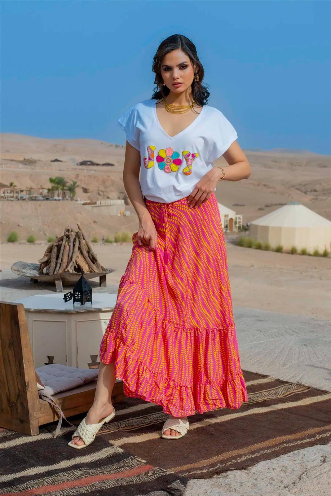 Dieser ausdrucksstarke Maxirock von Gold&Silver Paris bringt Farbe und Leichtigkeit in jede Sommergarderobe. Das lebendige grafische Muster in kräftigem Pink und warmem Orange sorgt für einen modernen, zugleich verspielten Look und macht den Rock zu einem echten Hingucker.