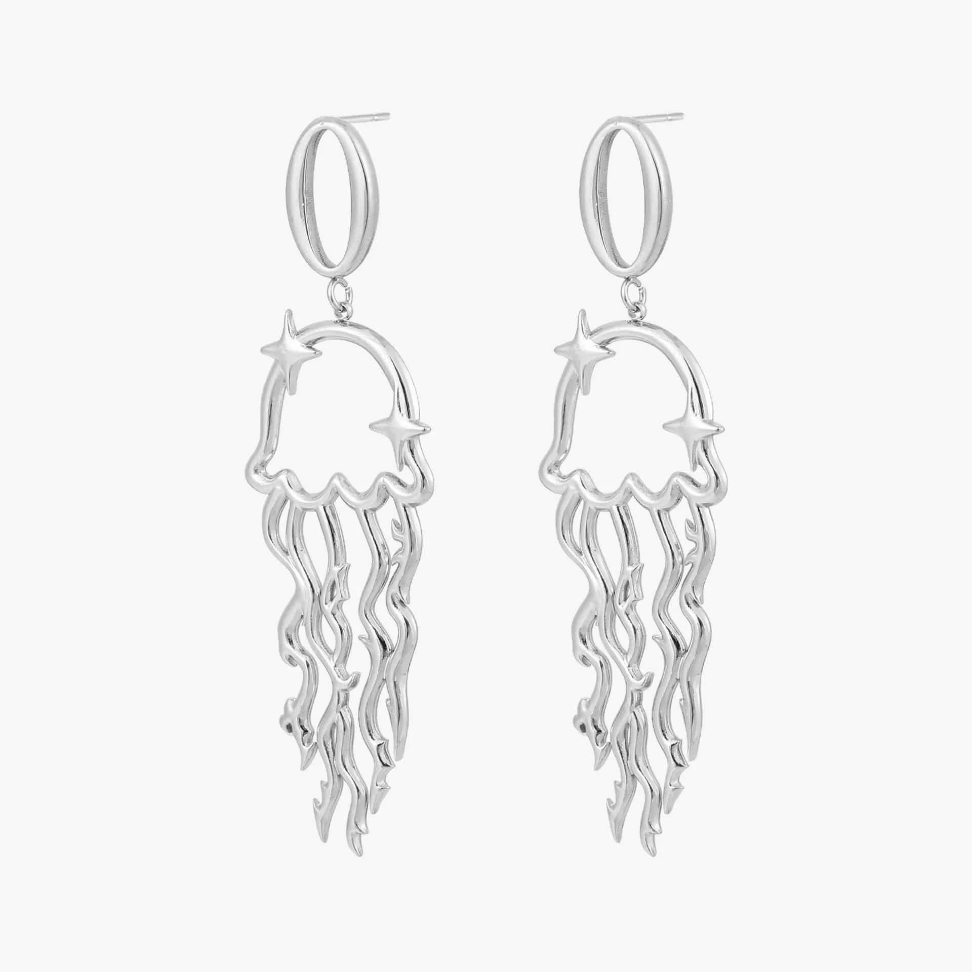 Ein Hauch von Ozean-Magie für dein Schmuckkästchen: Die eleganten Giuno Quallen-Ohrringe bringen das faszinierende Spiel von Licht und Bewegung des Meeres an dein Ohr. Gefertigt aus robustem, hochwertigem Edelstahl, bestechen diese Ohrringe durch ihre moderne Linienführung und ihr verspieltes Design mit Stern-Details.