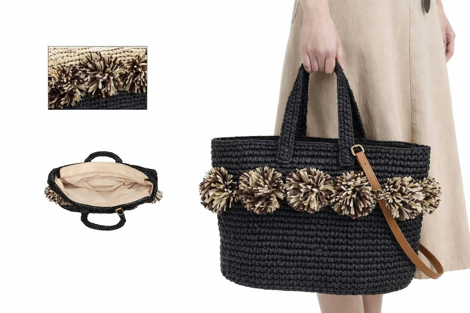 Die Tasche besteht aus robust geflochtenem Material und bietet durch ihre stabile Form ausreichend Platz für alle wichtigen Dinge des Alltags. Die dekorative Pompon-Bordüre sorgt für einen besonderen Blickfang und unterstreicht den lässigen Sommer-Look.