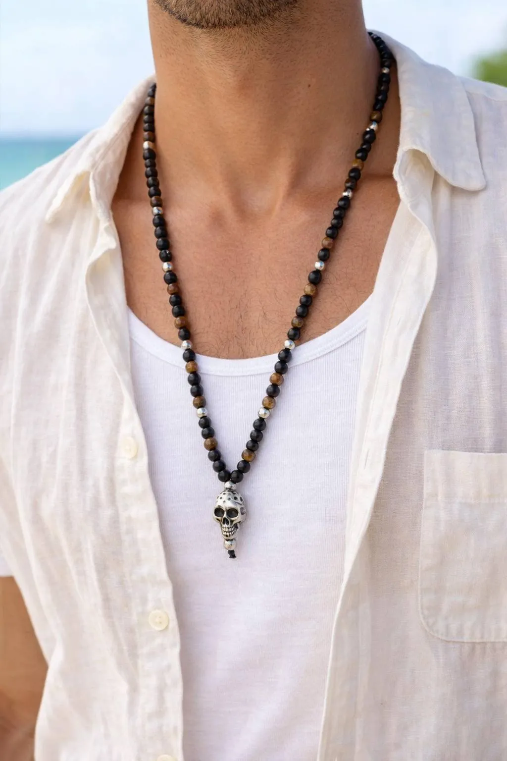 Diese stilvolle Herren-Kette kombiniert markantes Design mit hochwertigen Materialien. Die Kette besteht aus mattschwarzen Steinperlen und warmen braunen Naturstein-Elementen, die durch polierte Edelstahlperlen elegant ergänzt werden.