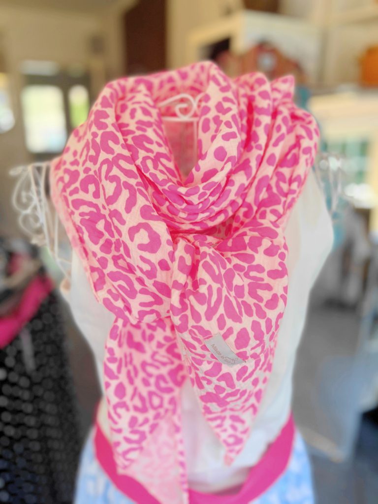 Eine lächelnde Frau trägt einen schicken blau-weißen Schal mit Leopardenmuster, ein leichtes beiges Oberteil und eine bequeme Bluejeans - perfekt zum Überziehen.
