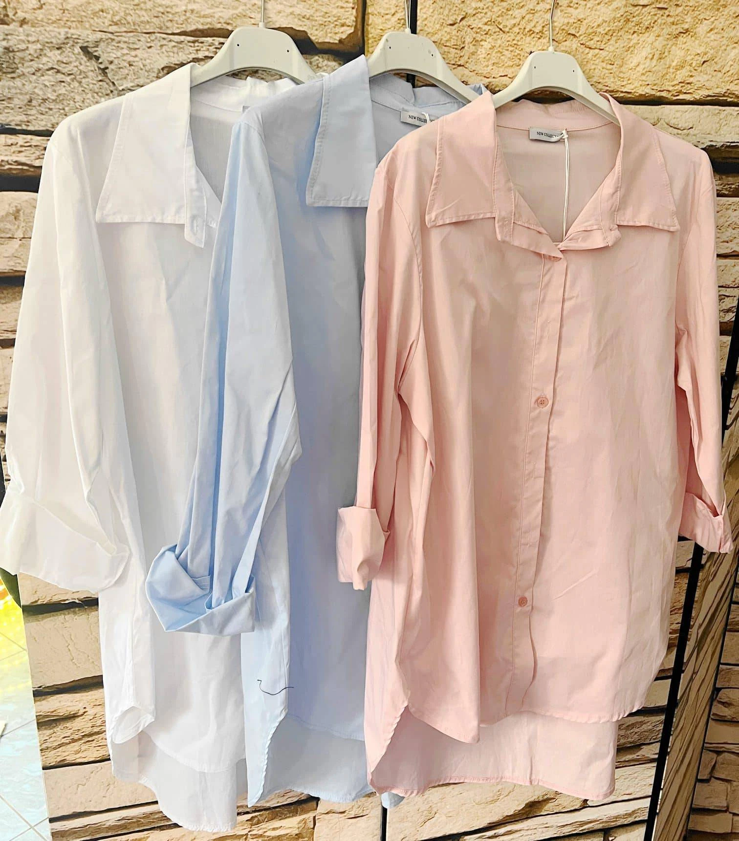 Mit ihrem klassischen Hemdkragen, der durchgehenden Knopfleiste und den langen Ärmeln (die sich lässig krempeln lassen) wirkt sie schlicht, aber dennoch elegant. Der leicht verlängerte, abgerundete Saum macht die Bluse besonders schmeichelhaft und ideal zum Tragen über Hose, Leggings oder auch offen als leichte Jacke.