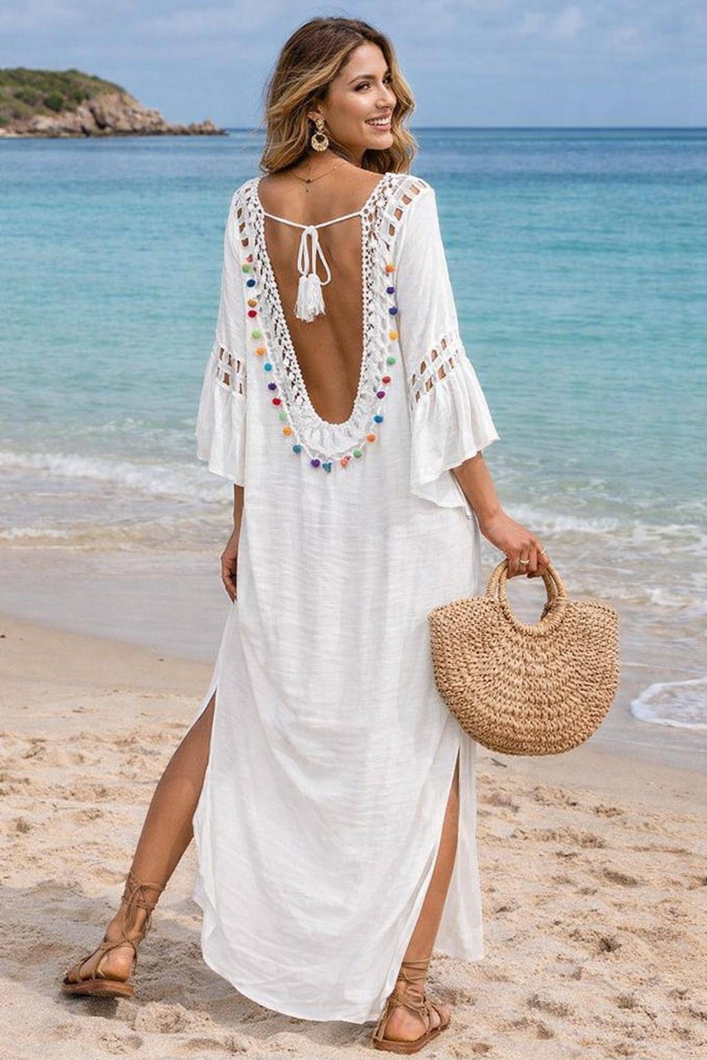 Ein besonderer Blickfang ist der tiefe V-Rückenausschnitt mit dekorativer Bindeschleife und Quaste. Zarte Häkel-Details und farbenfrohe Pompons verleihen dem Kleid einen verspielten Boho-Charakter und setzen lebendige Akzente. Die locker fallenden 3/4-Ärmel sowie die seitlichen Schlitze sorgen für Bewegungsfreiheit und unterstreichen die entspannte Eleganz des Designs.