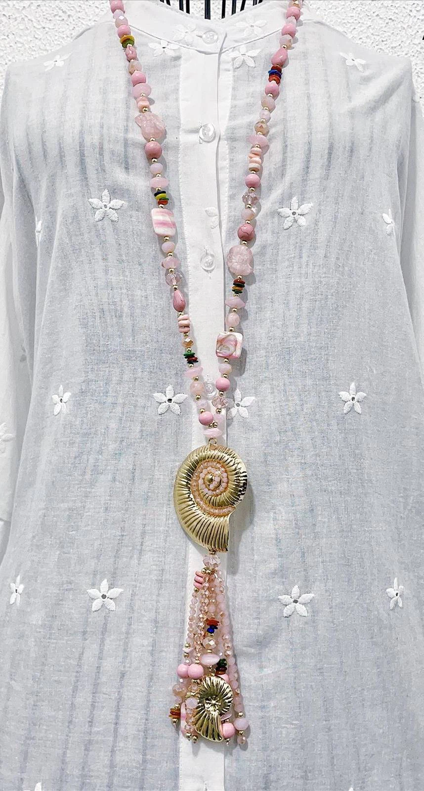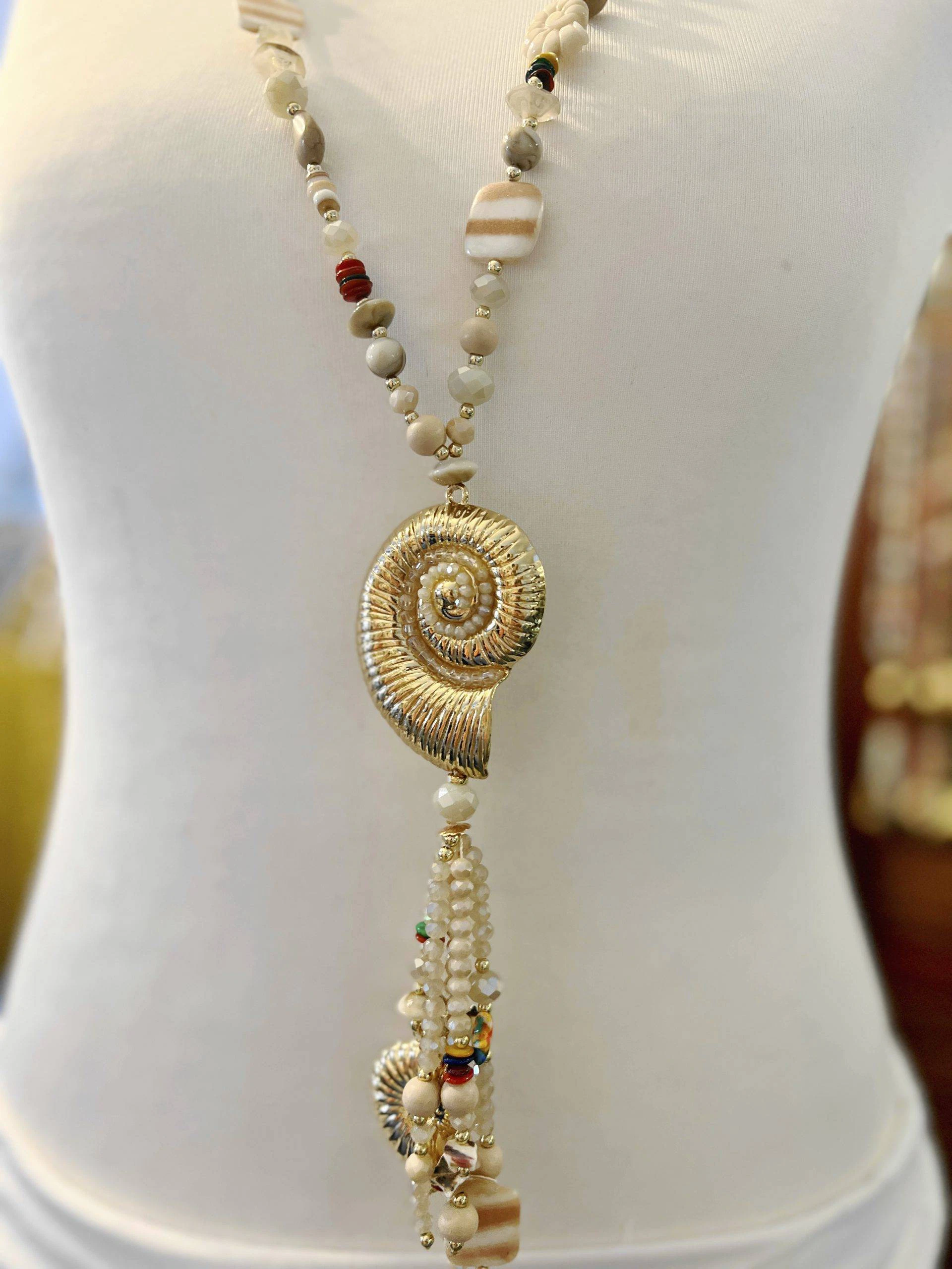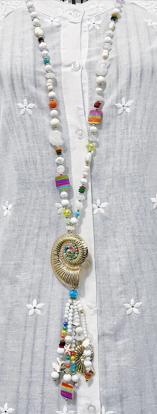 Diese außergewöhnliche lange Kette ist ein echtes Statement-Piece und vereint sommerliche Leichtigkeit mit kunstvoller Handarbeit. Im Mittelpunkt steht ein großer, spiralformiger Muschel-Anhänger in Goldoptik, der von einer detailreich gearbeiteten Quaste aus verschiedensten Perlen und kleinen Muschelelementen ergänzt wird.