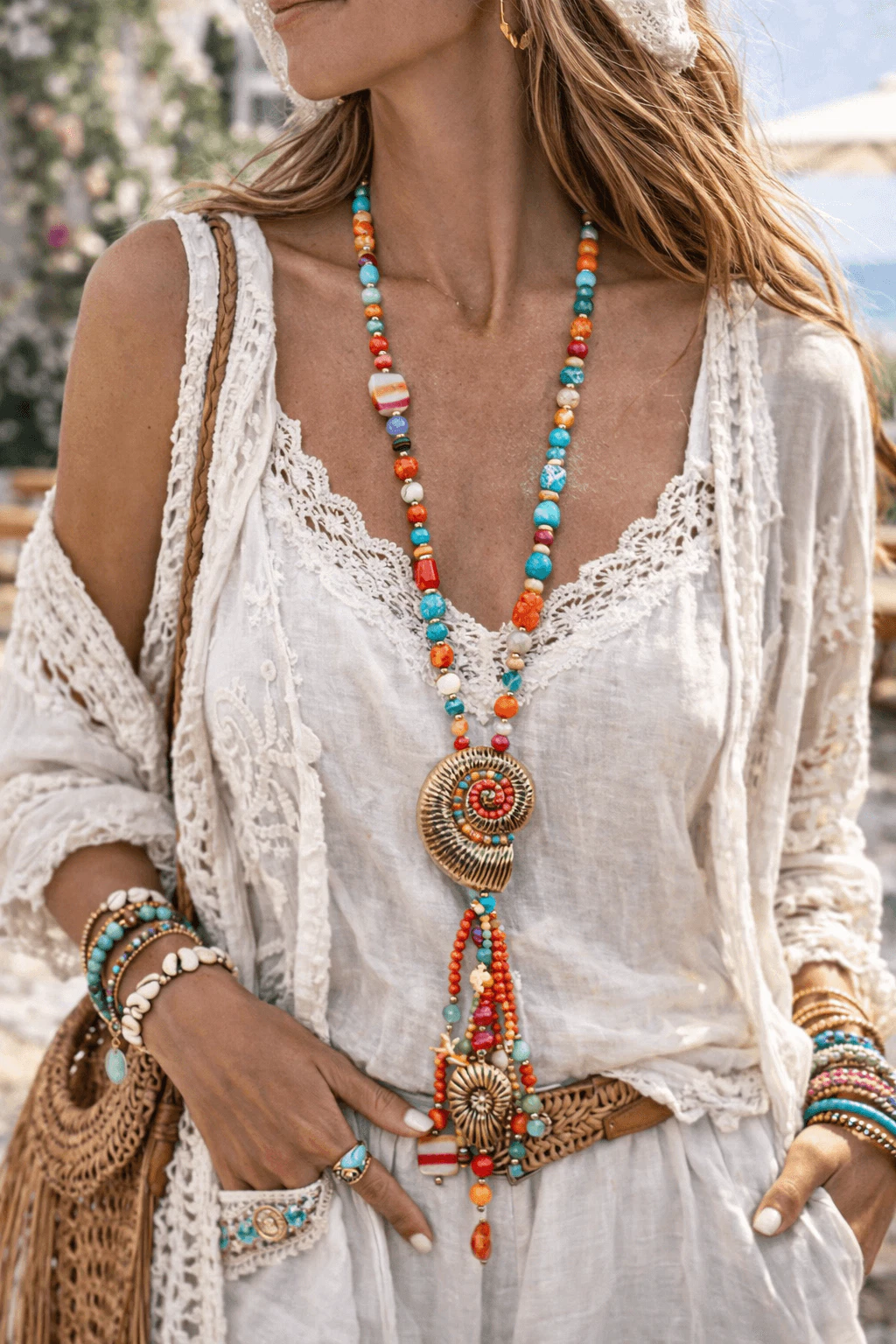 Sonnen- und Meeres-Boho-Kette: Frau mit langer, bunter Halskette mit Muschelanhänger und passenden Armbändern im Bohème-Stil.
