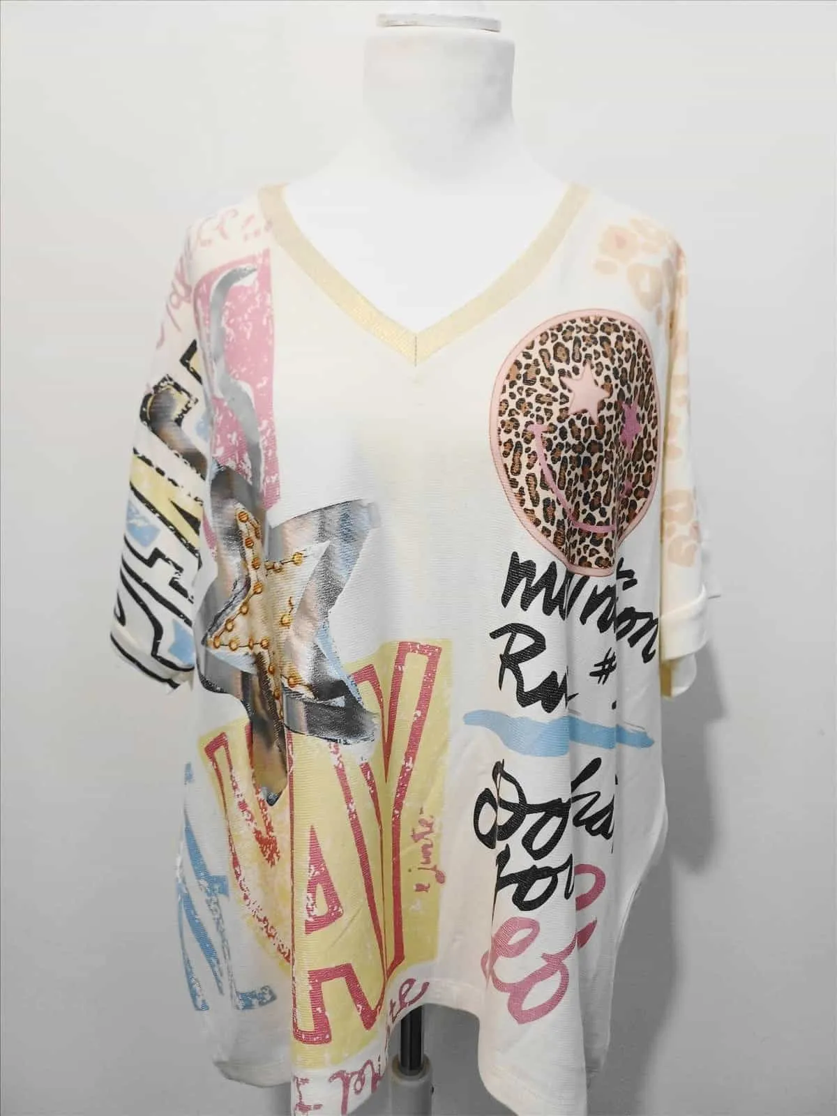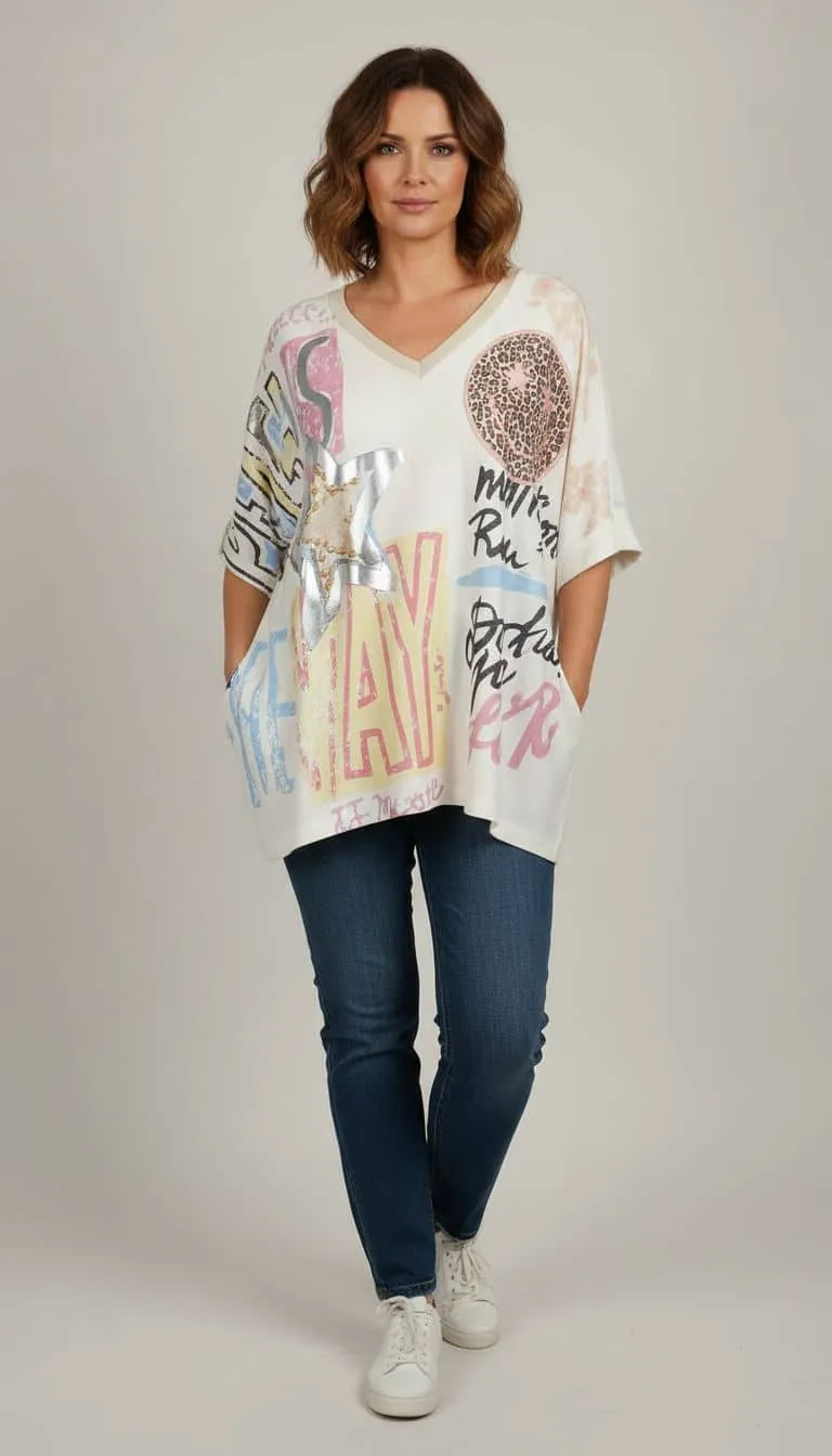 Der lässige, locker fallende Schnitt sorgt für ein angenehmes Tragegefühl und umspielt sanft die Figur. Der feminine V-Ausschnitt und die überschnittenen Ärmel unterstreichen die entspannte Silhouette und machen das Shirt zum perfekten Begleiter für stilvolle Casual-Looks.