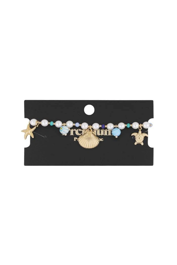 Trage die Magie des Meeres immer bei dir mit diesem bezaubernden Armband aus vergoldetem Edelstahl! Die Kombination aus zarten Süßwasserperlen, bunten Glasperlen und goldfarbenen Meeresanhängern macht dieses Schmuckstück zu einem echten Hingucker.